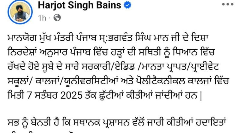 Read Moreपंजाब के सभी स्कूल, कॉलेज, शिक्षण संस्थान अगले 3 दिन बन्द रहेंगे – शिक्षा मंत्री, पंजाब